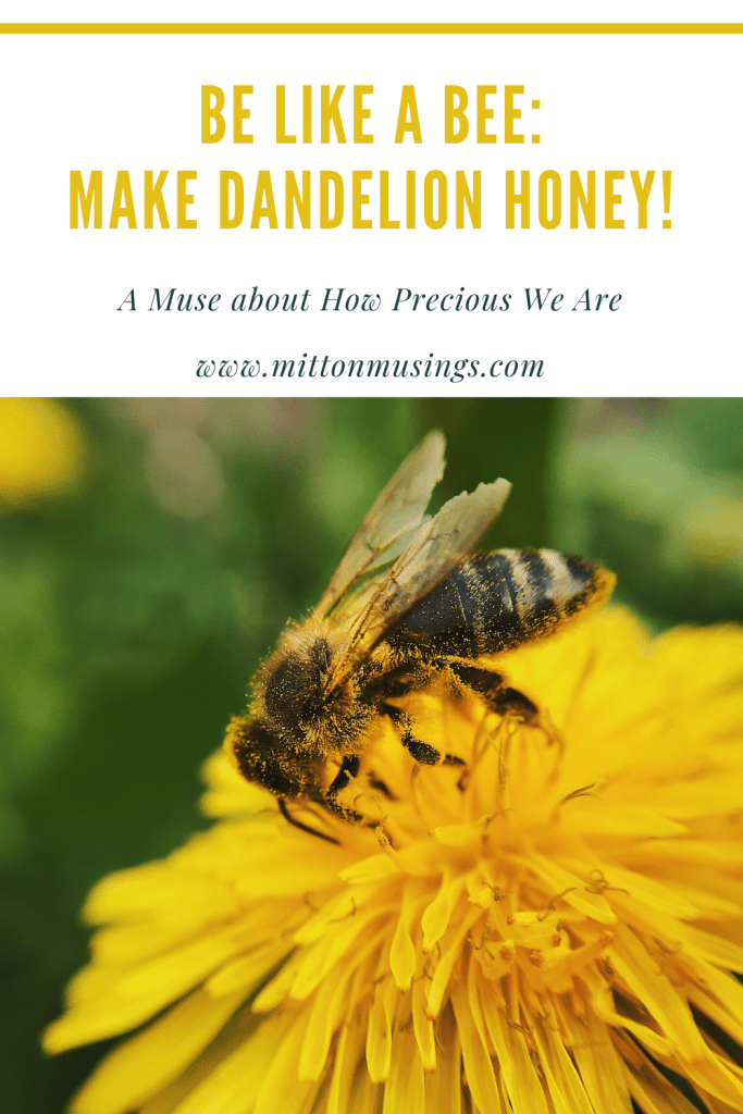 I want my kids (and me) to be reminded that we are children who belong to the Most High (Psalm 45) So often we feel insignificant. Worthless and commonplace with little to offer to a bigger world at large. How can we serve when we are so small? Or so common place that no one pays any attention to us? Especially when things can be air brushed and photoshopped. The scriptures remind us of our place. We are heirs to the throne and will one day sit next to the Creator of the world! He who delights in the honey bee and humble dandelion, finds absolute sweetness in the sight of us! Rejoice in this my beloveds! And be reminded of it next time a bee buzzes by, or you see that field of “weeds”.