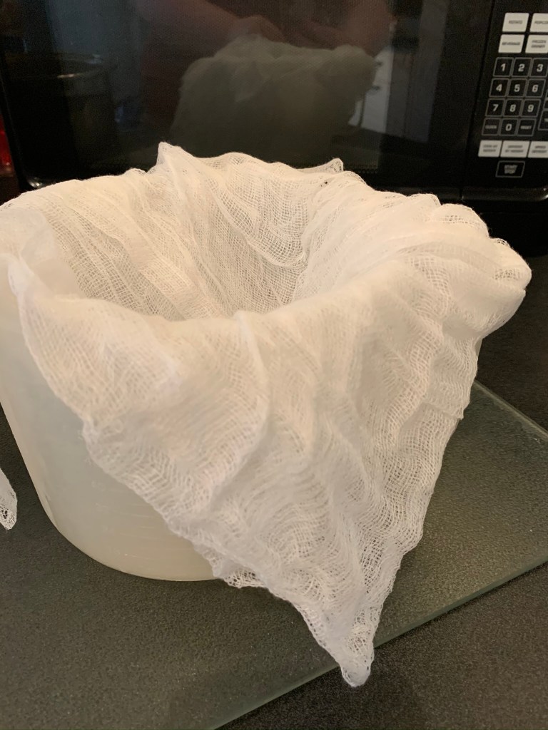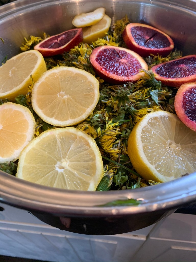 It’s kind of an old fashioned recipe, so measurements were not all that precise, which is just up my alley ‘cuz I love to “wing it” a lot in the kitchen. First, the hubby picked a bucket full of dandelion flower heads (from our very own lawn — which we knew was pesticide free and abundant). I rinsed them off and picked out some grass (and the odd ant). You can leave the green head on the flower, and although we left some stems on (because I am lazy) I learned after that the stems are fairly bitter so should be removed. Some videos made tiny batches of a few cups of flowers, but we had a lot! You then make a dandelion “tea” by covering the flowers with water and boiling all the goodness out of them (about a 10 minute boil). We added a sliced lemon and a sliced orange to season even more (as per the videos). The tea is then cooled and steeped overnight in the pot. The next day, I strained all the “juice” out with cheesecloth — about 10 cups worth of liquid from my “big batch”.